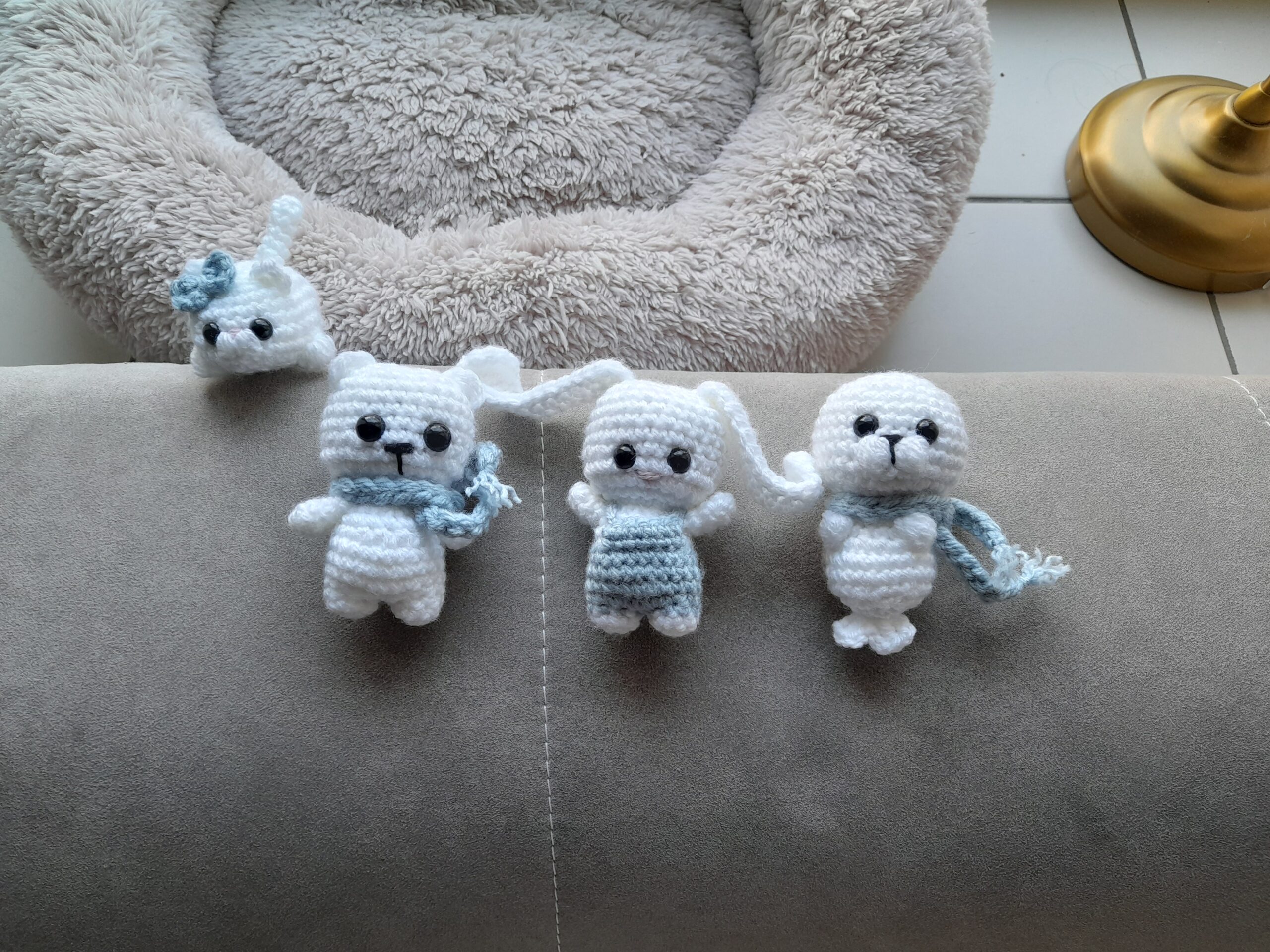Met alle sneeuw van de afgelopen tijd, leek het me leuk om een set schattige diertjes te maken onder het thema ‘sneeuw’. Ik vind het heerlijk om diertjes te haken met schattige accessoires of kleertjes. Dit geeft ze karakter en maakt ze nog sprekender. Daarom heb ik gekozen voor sneeuwwitte diertjes, met ijsblauwe accessoires en kleren.