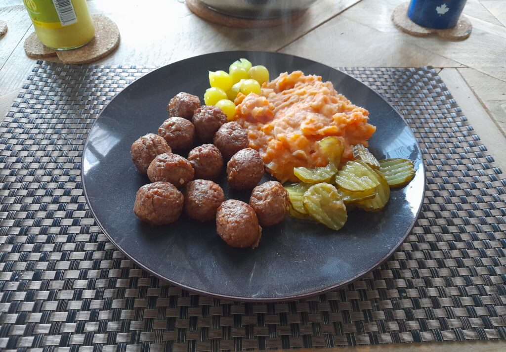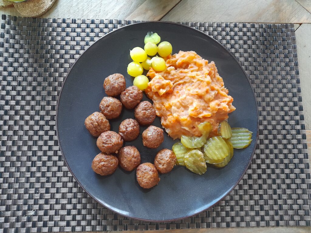 Zelf knijp ik vaak een plantaardig oogje dicht bij het maken van hutspot met zoete aardappelpuree, omdat ik gebruik maak van de kant-en-klare zoete aardappelpuree van de Jumbo. Een heerlijke romige puree, en te verklaren door de gepasteuriseerde volle melk op de ingrediëntenlijst.