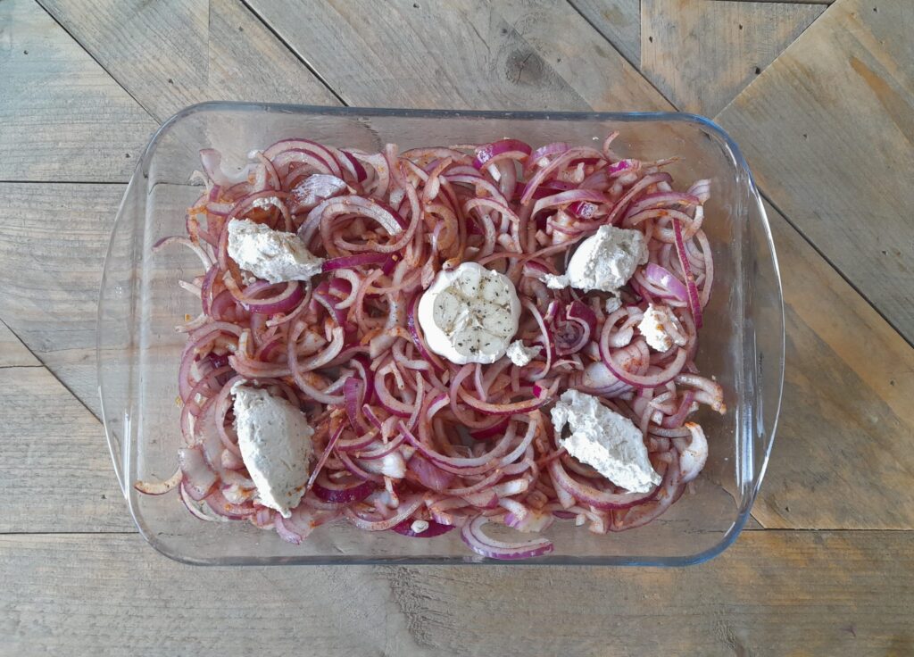 - Verdeel her en der tussen het uienmengsel eetlepels plantaardige Paturain.