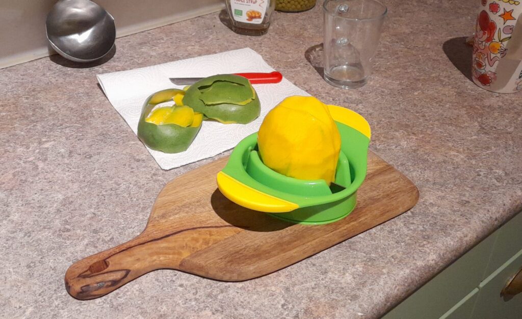 Iedereen die gek is op mango weet ook: die dingen zijn niet te snijden. Ze glibberen alle kanten op, je moet er ongeveer voor gestudeerd hebben om te weten welke kant je op moet snijden en voor je het weet zit het schilmesje in je eigen hand.
